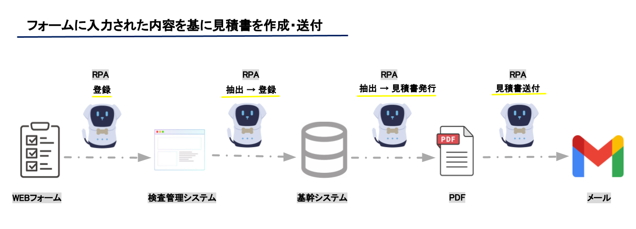 川北さん:そのほか、WEBフォームに入力された情報を基幹システムに取り組み、見積書を作成した上でお客さまに送付する業務も自動化しています。弊社では、お客さまに修繕や検査を提案するDMを送り、WEBフォームから申し込まれた内容にあわせて見積書を作成、送付しているのですが、この一連のプロセスもロボットが処理しています。定期的に100件から200件程発生するため、自動化により生産性を高められたと感じます。